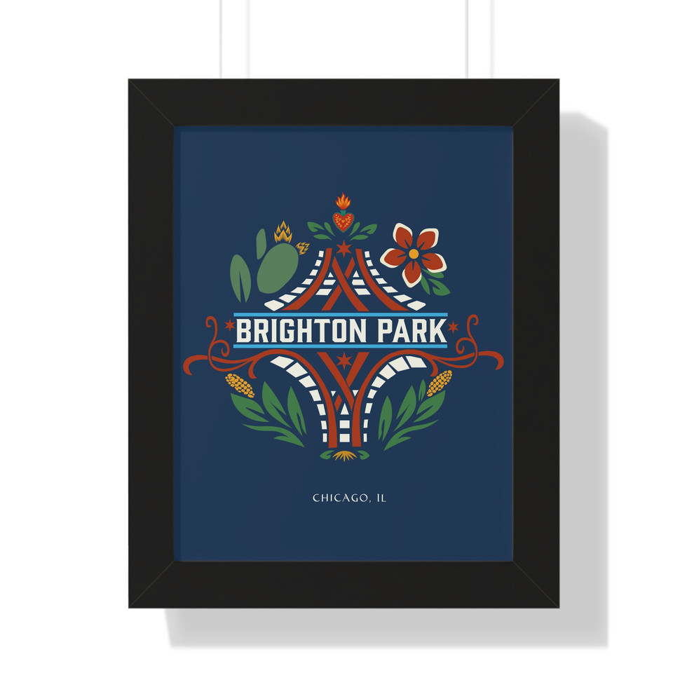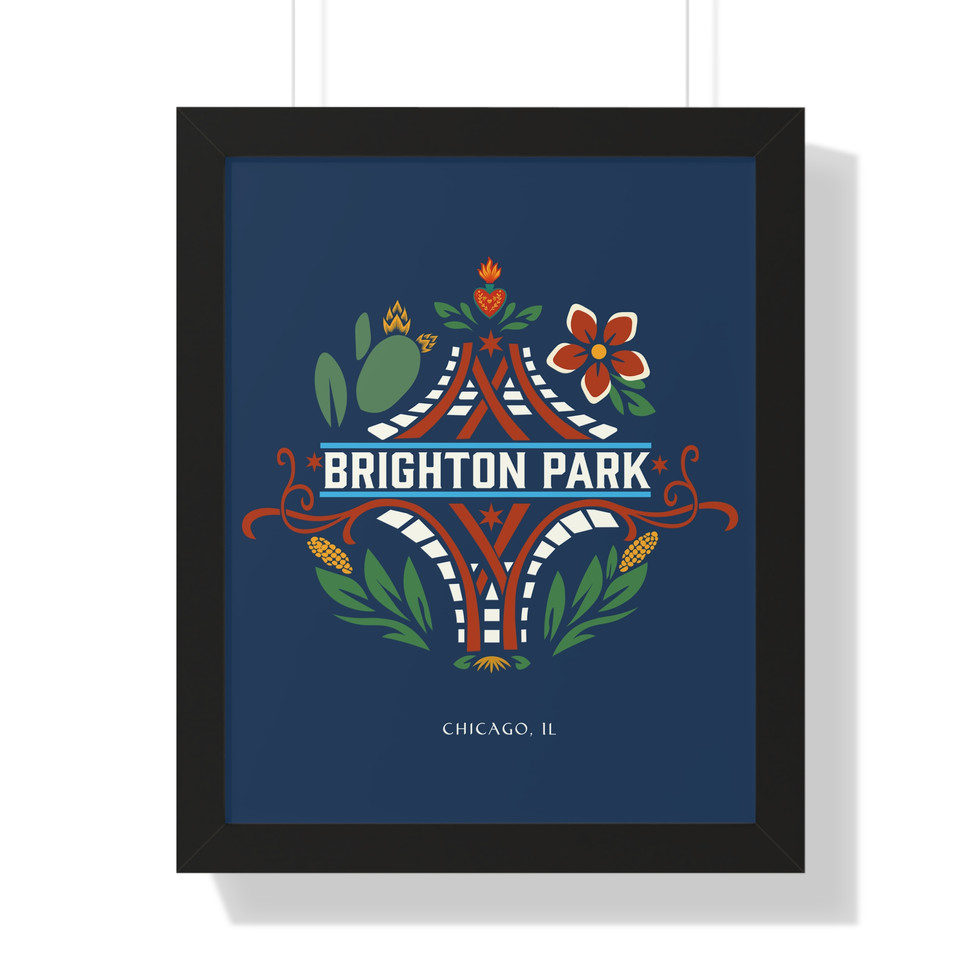 This Brighton Park emblem was designed to reflect the neighborhood’s layered history and cultural roots. At its center, the rail junction represents the train lines that once carried goods through the area, connecting Brighton Park to Chicago’s industrial network and shaping its identity as a working hub.