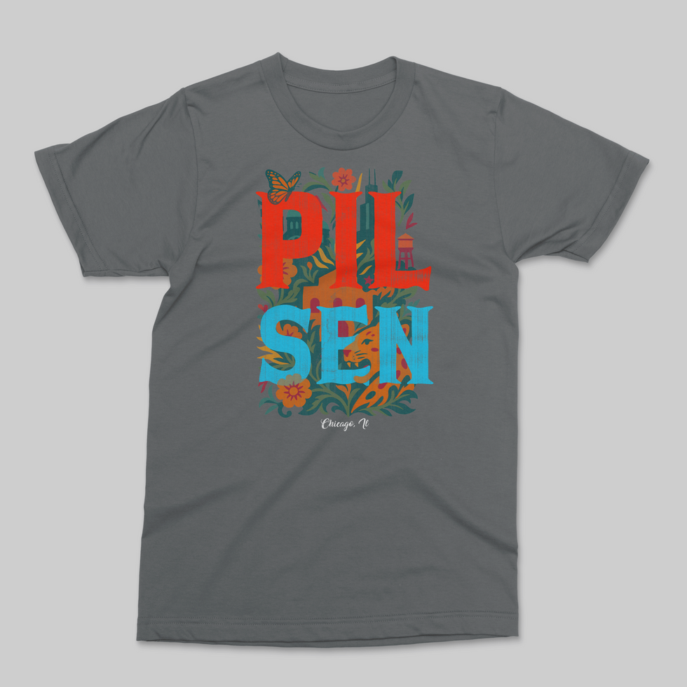 The PILSEN print blooms with symbolism—from butterflies of migration to the water tower watching over decades of change. It’s bold, it’s beautiful, and it’s unapologetically proud.